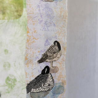 고은강 작가의 화면 속 캐나다 기러기들은 날개와 깃털을 지니면서도, 팔짱을 끼거나 손을 들어 대화하는 인간의 몸짓을 하고 있습니다. 특히 동물의 눈과 달리 흰자위가 또렷한 이들의 눈은, 낯선 땅에 정착했으되 완전히 동화되지 않은 이주자의 양가적인 감정을 드러냅니다. 작가의 이 작품들은 오늘을 살아가는 디아스포라의 시각으로 재구성된 ‘현대적 민화’라 할 수 있습니다.
